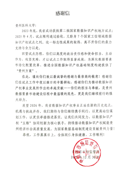 近日,我校收到贵州省市场监督管理局发来的感谢信,信中对学校在贵州省数据知识产权试点工作中作出的积极贡献予以高度肯定。